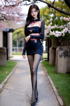 1girl, photorealistic, masterpiece, best quality, dark shot, (photo of portrait:1.2), solo, smile, looking at viewer, long black hair, Full-body photos,(wearing a red Chinese wedding dress:1.4), (an ancient bride adorned with gold hairpins and silver jewelry), an extremely delicate and beautiful,real person, fair skin,((Slender and perfect long legs)), (Perfect hands:1.4), (Full breasts:1.2), breasts,(see through:1.4) ,(blackpantyhose:1.2), (Under the peach blossom trees by the river:1.2), (stone bridges:1.3), ((poakl)), tutututu,black school uniform,black serafuku, sailor collar,black miniskirt, long sleeves, purple
