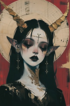 qzsx, horns, solo, 1girl, pointy ears, black hair, earrings, jewelry, long hair, red lips, portrait, makeup, black lips, red background, closed eyes, parted lips