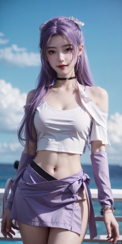 cowboy_shot,(Good structure), DSLR Quality,Short skirt,Blue sky, white clouds, ocean, nai3, 1girl, solo, crop top, , choker, navel, shirt, midriff, crop top overhang, looking at viewer, white shirt, jewelry, breasts, bare shoulders, off-shoulder shirt, off shoulder, black choker, thighs, stomach, long hair, bracelet, short sleeves, ribbon, hand up, collarbone, hair ribbon, medium breasts, , bra strap, , hair ornament, thigh gap, necklace, expressionless, , ,kind smile, ,, yunxiao,purple eyes, purple hair,