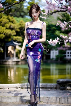((Masterpiece, best quality),1girl,solo,super detailed,8k,realistic,sharp focus,very detailed,professional lighting,spotlight,colorful details,detailed texture,(purple dress:1.5),(most suitable hairstyle:1.4),(most helpful posture:1.3),(full body photo:1.4),Full breasts,cleavage,perfect style,body,18 year old,smile,(transparent:1.5),(background is Suzhou gardens:1.5),(Under the peach blossom tree),dynamic pose, ((poakl)),