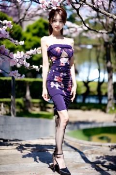 ((Masterpiece, best quality),1girl,solo,super detailed,8k,realistic,sharp focus,very detailed,professional lighting,spotlight,colorful details,detailed texture,(purple dress:1.5),(most suitable hairstyle:1.4),(most helpful posture:1.3),(full body photo:1.4),Full breasts,perfect style,body,18 year old,smile,transparent,(background is Suzhou gardens:1.5),(Under the peach blossom tree),dynamic pose, ((poakl)),