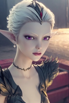 medium full shot,aerial view,1girl,purple eyes,hair ornament,jewelry,earrings,masterpiece,(best quality),official art,extremely detailed cg 8k wallpaper,(extremely delicate and beautiful),solo,realistic,photo_\(medium\)1girl,solo,meila,pointy ears,colored skin,short hair,white hair,<lora:meila_20240326041306:0.7>,