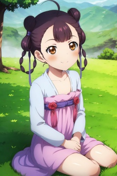 HDR,UHD,best quality,Highly detailed,masterpiece,Professional,<lora:dongfangqinlan:0.9>,dongfangqinlan,1girl,solo,blush,brown eyes,outdoors,dress,braid,brown hair,hair bun,twin braids,double bun,bow,smile,sitting,crossed legs,
