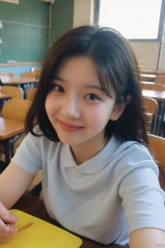A masterpiece capturing the beauty of a high school girl in the best quality and ultra high resolution. The detailed description focuses on specific image details, showcasing the girl's youthful charm, radiant smile, and stylish attire. The scene is set in a typical high school classroom, with students engaged in learning activities in the background. The atmosphere exudes a sense of youthful energy and optimism, creating a warm and inviting ambiance. The photography employs professional techniques, utilizing creative angles and compositions to highlight the girl's natural beauty and confidence.