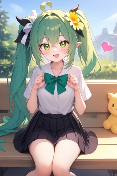 "(best quality),(ultra detailed),(clean face),(beautiful face),(smooth skin),(high quality),(fine texture),(unparalleled masterpiece),(surreal 8k)" ,1girl  solo  loli  long hair  looking at viewer  smile  open mouth  bangs  skirt  shirt  hair ornament  hair between eyes  sitting  green eyes  white shirt  flower  white hair  short sleeves  :d  heart  multicolored hair  green hair  alternate costume  pointy ears  hair flower  side ponytail  symbol-shaped pupils  gradient hair  green skirt  bench  heart hands  nahida \(genshin impact\)