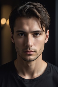 high quality, face portrait photo of 30 y.o european man, wearing black shirt, serious face, detailed face, skin pores, cinematic shot, dramatic lighting