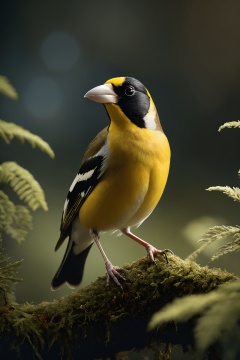 National Geography, Award winning pan shot of a Evening Grosbeak in the wild, full-body, atmospheric lighting. by pascal julio and nadine albuquerque, 2000s vintage RAW photo, photorealistic, film grain, candid camera, color graded cinematic, eye catchlights, atmospheric lighting, imperfections, natural, shallow dof, High level of detail to create a photographic-like image, focusing on lighting, realistic textures, hyperdetailed.