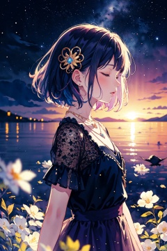 (depth of field:1.25), (blurry, blurry foreground:1.35)//(watercolor \(medium\):1.25), color splashing, fussion of Fluid abstract art,colorful,//flat color, by wlop,(double exposure of girl and universe:1.35),//(from beside:0.85), cowboy shot,(1girl,1girl), closed mouth, closed eyes,solo, liquid starry hair, short purple starry hair,star-shaped hair ornament, liquid starry lace dress tulle skirt,jewelry necklace,//Extremely and detailed Starry sky background,wind,nebula-background,fantastic-wind nebula,in flower blossoms, birds,watercolor