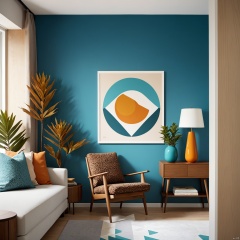 teal wall, modern furniture, Scandinavian interior design, hexagonal art prints, nature illustrations, deer, trees, mountains, sun, gradient, color blocking, minimalistic style, indoor plant, ceramic vase, floor lamp, angled legs, wood grain texture, mid-century modern, bookshelf styling, framed artwork