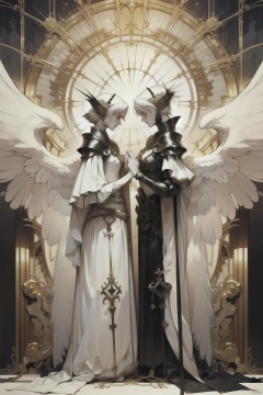 qzsx, wings, armor, cross, robe, feathered wings, angel wings, standing, angel, short hair, from side, black wings, pauldrons, shoulder armor, profile, multiple boys, white hair, full body, contrast, closed eyes, wide sleeves, multiple wings, white robe, 1girl, 2boys, weapon, dress, covered eyes, sword, long sleeves