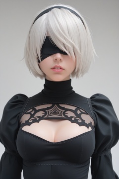 score_9, score_8_up, score_7_up, best quality, masterpiece,realistic, 1girl, solo, blindfold, yorha no. 2 type b, black blindfold, upper body, puffy sleeves, dress, short hair, white hair, black dress, juliet sleeves, hairband, breasts, cleavage cutout, long sleeves, parted lips, turtleneck, clothing cutout, black hairband, medium breasts, covered eyes, mole under mouth, mole, lips, pink lips, nose, facing viewer, hair over eyes, teeth