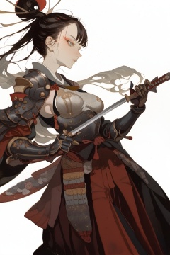 warrior, 1girl, weapon, solo, sword, armor, black hair, white background, hip vent, breasts, japanese clothes, simple background, hakama, profile, gauntlets, looking at viewer, long hair, hair rings, holding, standing, japanese armor, medium breasts,