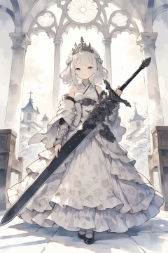 princess, 1girl, holding sword, white theme, dress, church, indoors, vivid, hands on hilt,