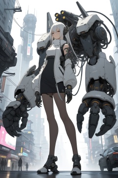 gigantic mechanical arms, 1girl, cyberpunk, science fiction, city, cowboy shot,