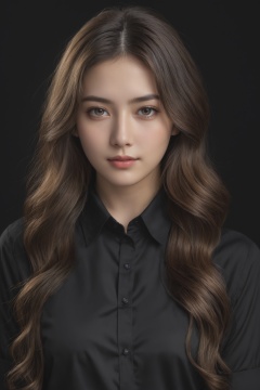 masterpiece, best quality, ultra-detailed, ultra high res, (photorealistic:1.4), raw photo, (realistic:0.2), 8k HDR, realistic lighting, 1girl, solo, looking at viewer, long wavy hair, (detailed oily skin), black eyes, (detailed face), (simple black background:1.1), (upper body:1.2), collared black shirt