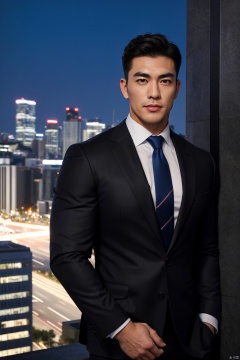 (absurdres, highres, ultra detailed, realistic, ), 1 male, solo, *****, mature, tall muscular guy, broad shoulders, handsome, very short hair, black hair, brown eyes, angular jaw, thick neck, thick eyebrows, night, dark, the night view of the city background, formal suit, necktie, upper body
