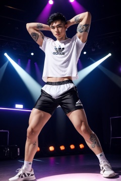 toned young man,full body,spiky black hair,white adidas shirt,tight fitting silk shorts,bulge,((tattoo on arms)),chavalpha,in a nightclub dancing,disco lights,