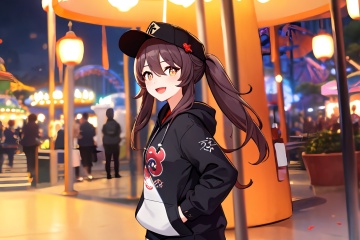 masterpiece,best quality,hu tao,1girl,(solo:1.1),<lora:hutao-000009:0.6>,(hoodie:1.2),looking at viewer,blush,smile,open mouth,playground,carousel,ferris wheel,fountain,from side,landscape,blurry background,hand in pocket,black short shorts,standing,upper body,(plum-shaped pupils:1.2),