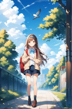 1girl, solo, long hair, looking at viewer, bangs, brown hair, shirt, long sleeves, bow, holding, brown eyes, closed mouth, school uniform, standing, jacket, white shirt, cowboy shot, hairband, outdoors, open clothes, sky, shorts, day, cloud, hood, bowtie, bag, tree, blue sky, book, bird, blue bow, backpack, cardigan, holding book, blue bowtie,full body
