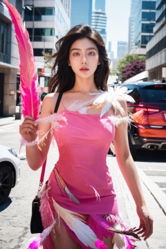 (ultra realistic,best quality),photorealistic,Extremely Realistic, in depth, hubg_jsnh, cinematic light,hubgwomen,girls dead monster, Erjie, girl in a fluid and dynamic pose, wearing a loose, flowing pink dress, mysterious expression, curly black and pink hair,hubg_jsnh, night, in a modern and abstract setting, with bold and colorful abstract art, blurred background, bright lighting, official art, uniform 8k wallpaper,(Feathers everywhere :1.3), depth of field level, HUBG_Film_Texture