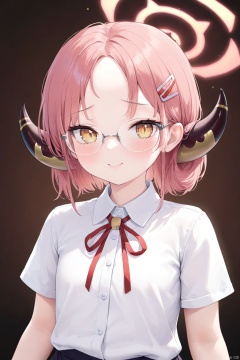 short hair, bangs, shirt, hair ornament, ribbon, yellow eyes, white shirt, pink hair, short sleeves, red hair, horns, glasses, hairclip, collared shirt, red ribbon, neck ribbon, alternate hairstyle, halo, aged down, demon horns,alternate hair length,aru \(bluearchive\),aruYoung,