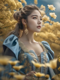 super fine illustration,masterpiece,best quality,dynamic_angle,{beautiful detailed eyes},1girl,finely detail,Depth of field,4k wallpaper,bluesky,cumulus,wind,insanely detailed frills,extremely detailed lace,BLUE SKY,very long hair,Slightly open mouth,high ponytail,silver hair,small Breasts,cumulonimbus capillatus,slender waist,There are many scattered luminous petals,Hidden in the light yellow flowers,Depth of field,She bowed her head in frustration,Many flying drops of water,Upper body exposed,Many scattered leaves,branch,angle,contour deepening,cinematic angle,{{{Classic decorative border}}},<lora:lora:0.8>,