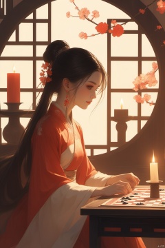 1girl,long hair,solo,a flower cat,jewelry,earrings,single hair bun,chinese clothes,table,sitting,board game,flower,circular window,window,dress,from side,hair ornament,hair bun,long sleeves,red dress,black hair,indoors,looking down,profile,brown hair,candle,light,GFGF,