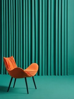 ,XCYP HOME, chair,still life,no humans,vibrant orange chair,pleated design,soft fabric folds,bold color,contemporary style,teal background,dramatic lighting.,