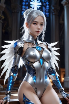 {{masterpiece}}, flat chestbest quality},{highres},solo,flat_chest,a girl inside the church with white hair and blue pupil surrounded by {many} glowing {feathers} in cold face,detailed face,night with bright colorful lights whith richly layered clouds and clouded moon in the detailed sky,{a lot of glowing particles},high ponytail,mecha clothes,robot girl,cool movement,sliver bodysuit,{filigree},delicate and (intricate) hair,((sliver)) and (broken) body,blue streaked hair,full body,Depth of field, sitting on a {blue star}