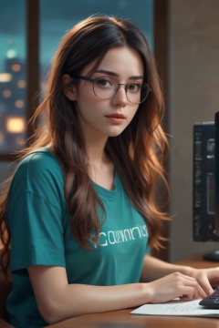 Portrait of a young woman working on her computer late at night, (warm interior lighting:1.2), (window in the background:1.1) (Concentration:1.3),(focused expression:1.4) (long wavy hair:1.2), (thick-framed glasses:1.1) (graphic t-shirt:1.1), (casual and comfortable:1.2) (realistic and detailed:1.4), (tones of orange and teal:1.3) digital illustration inspired by the works of Craig Mullins and Android Jones, trending on ArtStation and DeviantArt, 8000 x 8000 resolution, (cinematic composition:1.3) lifelike shading and textures, backlit with volumetric lighting. award-winning visuals, intimate mood, thoughtful and compelling. (artgerm:0.7), (wlop:0.3)