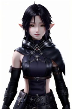 ((HRD, HUD, 8K)),((masterpiece, best quality)), highly detailed, soft light,1girl, solo, elf, pointy ears, yellow eyes, black hair, short hair, eips, belt,simple background, white background, (upper body:1.2), standing, looking at viewer,<lora:长夜开拓者琥珀_v1.0:0.7>
