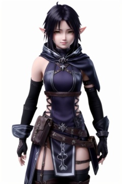 ((HRD, HUD, 8K)),((masterpiece, best quality)), highly detailed, soft light,1girl, solo, elf, pointy ears, yellow eyes, black hair, short hair, eips, gloves, fingerless gloves, elbow gloves, belt, thighhighs,simple background, white background, cowboy shot, standing, looking at viewer, <lora:20240327-1711550230751:0.72>