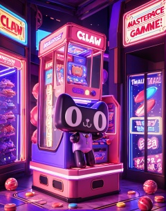 masterpiece, best quality,Tmall,Tmall,Tmall ip,Rich details, C4D modeling, octane render,Claw machine, in the arcade, happy, blue purple light, play games  <lora:Tmall SDXL-000006:0.8>, masterpiece, best quality,