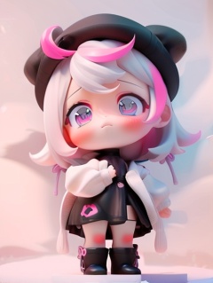 best quality,masterpiece,3D,C4D,1girl,solo,looking at viewer,blush,full body,bangs,dress,jacket,pink hair,chibi,white hair,multicolored hair,pink eyes,virtual youtuber,medium hair,black footwear,white headwear,princess skirt of fans,