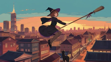 (best quality), ((masterpiece)), (highres), illustration, original, extremely detailed,  <lora:城静时光茶香美:0.7> kiki \(majo no takkyuubin\), 1girl, broom riding, broom, black cat, cat, flying, hair bow, dress, bow, short hair, cityscape, city, brown hair, sky, witch, outdoors, scenery, animal
