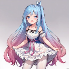 masterpiece, bestquality, Witchcrafter Madame Verre, 1girl, solo, long hair, looking at viewer, blush, smile, open mouth, blue eyes, dress, bare shoulders, very long hair, blue hair, pink hair, pantyhose, multicolored hair, gradient hair, white pantyhose,