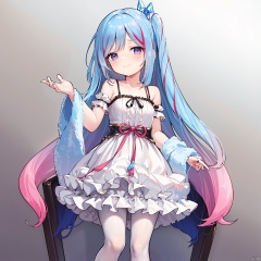 masterpiece, bestquality, Witchcrafter Madame Verre, 1girl, solo, long hair, looking at viewer, blush, smile, bangs, hair ornament, dress, bare shoulders, very long hair, closed mouth, blue hair, standing, purple eyes, collarbone, pink hair, pantyhose, red hair, multicolored hair, boots, sleeveless, hand up, off shoulder, white dress, two-tone hair, streaked hair, gradient, parted bangs, fur trim, gradient background, sleeveless dress, feet out of frame, one side up, frilled dress, strap slip, white pantyhose, off-shoulder dress, smug, fur-trimmed boots,