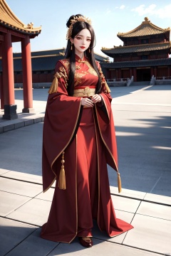 Realistic style, cinematic work, 8K wallpaper, masterpiece, very realistic quality, best quality, masterpiece, high-level, high-resolution,,,Edge lighting, dual tone lighting, soft lighting, The illuminated surface of the material has bright spots and highlights, which flicker and have a mirror effect when reflected, There are sparkling spots on the armor,,,1girl, solo, full body, black hair, hair ornament, long hair, hanfu, chinese clothes, long sleeves, dress, jewelry, flower, hair flower, wide sleeves, hair stick, shawl, looking at viewer, standing,golden proportion of female body,,,Standing, standing posture, Sexy full body standing posture,,,colorful,(detailed skin: 1.3), clear focus,delicate,(mature women: 1.2),(big_eyes),red_ eyeshadow,long_ Eyelashes, red lips,,,((Outdoor, Sky, Ancient City, taihe Palace, forbidden city, ancient chinese architecture)), Phoenix Robe, aerhangeersike, (\wei lai de jia\)<lora:EMS-330893-EMS:0.200000>, <lora:EMS-31****-EMS:0.200000>