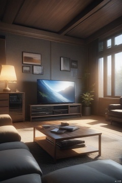Living room, TV, no humans, , window, table, book,interior design, living room, masterpiece,best quality,unreal engine 5 rendering,movie light,movie lens,movie special effects,detailed details,HDR,UHD,8K,Indoor, living room, TV_ cabinet