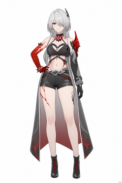 score_9,score_8_up,score_7_up,best quality,masterpiece,source_anime,8k,best quality,masterpiece,(ultra-detailed),(high detailed skin),(full body),white background,standing,looking at viewer,(solo),hand on hip,whuangquan, white hair, asymmetrical clothes, 1girl, breasts, long hair, red eyes, hair over one eye,navel,bangs,cleavage,bloody hand,single glove,(left single sleeve),grey pic,(white background, simple background),,full_shot<lora:EMS-333557-EMS:0.800000>