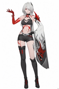 score_9,score_8_up,score_7_up,best quality,masterpiece,source_anime,8k,best quality,masterpiece,(ultra-detailed),(high detailed skin),(full body),white background,standing,looking at viewer,(solo),hand on hip,whuangquan, white hair, asymmetrical clothes, 1girl, breasts, long hair, red eyes, hair over one eye,navel,bangs,cleavage,bloody hand,single glove,(left single sleeve),long_sleeve,(white background, simple background),,full_shot<lora:EMS-333557-EMS:0.900000>