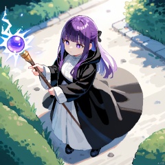 1girl, fern \(sousou no frieren\), sousou no frieren, purple hair, solo, purple eyes, bangs, grass, outdoors, hair ribbon, short hair, holding, eyebrows visible through hair,(holding staff, holding wand, staff:1.5), cloak, dress, long sleeves, closed mouth, bright pupils, blunt bangs, hair bow, day, standing, white pupils, path, expressionless, black cloak, road, hood, black robe, black footwear, robe, younger, kneeling, shadow, hood down, sleeves past wrists, hooded cloak, white dress, black coat, shiny hair, v arms, child, black cape, bush, looking up, coat, cape, black dress, from above, hooded robe, plant, bob cut, shiny, black jacket, dirt road, sleeves past fingers, sunlight, nature, dirt, shoes, wide sleeves, dot nose, medium hair, turtleneck, leaf, white sweater, on ground, boots, pantyhose, shade, jacket, skirt, long dress, hair ornament, long hair, white shirt, dirty, black legwear, glowing eyes, (magic girl, magic, electricity, electrokinesis, pyrokinesis, casting spell:1.8), (dynamic pose, dynamic angle:1.5), (face focus, cowboy shot, close-up face, backlight:1.2), perfect features, intricate details, ray tracing, depth of field, ultra resolution image, (very aesthetic, newest, best quality, masterpiece:1.5), (Illustrate a translucent watercolor painting, with delicate washes of color, subtle blending, and an airy, dreamlike quality.), (sketch, outline, lineart:1.1), (oekaki, tegaki, backlight:1.2),