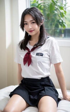 solo,pantyhose,school uniform,skirt,red skirt,sitting,long hair,window,1girl,serafuku,bow,short sleeves,indoors,sailor collar,red skirt,bangs,bowtie,shirt,looking at viewer,cosplay,white shirt,red bow,grey hair,smile,black pantyhose,on bed,pleated skirt,black hair,own hands together,feet out of frame,<lora:TUIBUXIJIE:lbw=OUTS>,sitting sideways,