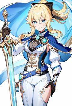 1girl, jean \(gunnhildr's legacy\) \(genshin impact\), genshin impact, gloves, belt, white background, medium breasts, cowboy shot, blonde hair, holding weapon, closed mouth, sword, medium hair, sidelocks, looking at viewer, breasts, white pants, standing, vision \(genshin impact\), official alternate costume, tight clothes, blue belt, simple background, blue eyes, smile, ponytail, thighs, black gloves, holding, detached sleeves, black bow, weapon, tight pants, hair bow, capelet, bow, pants, favonius sword \(genshin impact\), holding sword, blue capelet, long bangs, solo, hand up, hair between eyes, very aesthetic, masterpiece, best quality, absurdres, sensitive