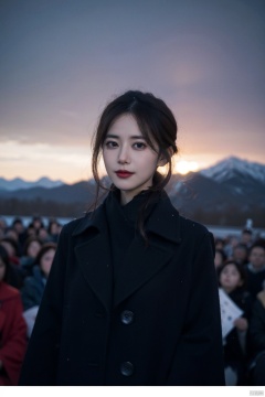 (Not looking at the audience: 1.5),scarf,portrait of 1girl by Bill Henson,Black Cashmere coat,masterpiece,best quality,highres,2girls,flora,snowing,bokeh,low contrast,sharp and in focus,(art by Chris Friel:1.2),(night),looking at viewer,sad,melancholy,drillhair,wind,cinematic_angle,(cinematic tone:1.2),mountaintop,cowboy shot,floating hair,rule of thirds,charming smile