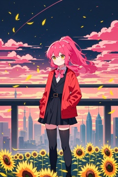 tianliang duohe fangdongye,chen bin,omone,,((masterpiece, best quality)),beautifuldetailedlighting, (best quality),((masterpiece)),(highres),standing,(full body),(black thighhighs),original,extremely detailed wallpaper,(an extremely delicate and beautiful),(loli:1.2),(petite:1.2),Pink hair,Yellow eyes,(red Jacket),high ponytail,white collared shirt,hair flower,fipped hair,floating hair,Frown,hands in pockets,black dress,red bowtie,(solo),sky,skyline,skyscraper,smile,solo,sunflower,tower,upper_body,white flower, solo
