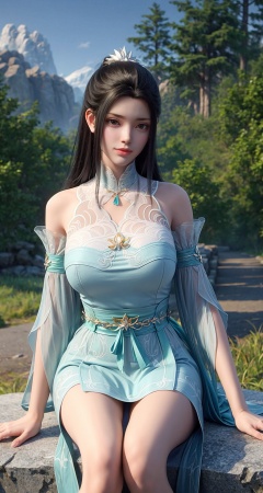 1girl,solo,black hair,long hair,sash,jewelry,hair ornament,bare shoulders,necklace,off-shoulder dress,<lora:add_detail细节增加:0.7>,scenery,outdoors,tree,day,sky,nature,mountain,forest,rock,blue sky,long_legs,huge filesize,realistic,reality,<lora:熏儿:0.7>,long_legs,close-up,solo_focus,sitting,looking_at_viewer,