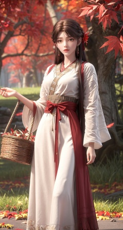 <lora:add_detail细节增加:0.8>,<lora:梦幻白1:0.2>,1girl,solo,hair ornament,long hair,hair flower,brown hair,jewelry,earrings,brown eyes,lips,realistic,closed mouth,chinese clothes,dress,basket,outdoors,autumn leaves,autumn,solo focus,flower,holding basket,leaf,tree,day,long sleeves,grass,maple leaf,long skirt,water,sky,depth of field,rock,ribbon,red ribbon,hairpin,hair stick,looking at viewer,eyelashes,red lips,scenery,nature,forest,sunlight,tassel,wide sleeves,<lora:火灵儿上界:0.7>,long_legs,