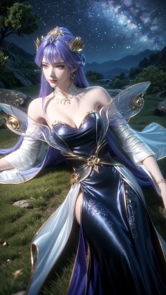 1girl,jewelry,dress,solo,earrings,long hair,hair ornament,bracelet,bare shoulders,chinese clothes,blue hair,blue eyes,necklace,detached sleeves,sky,tree,night,realistic,lips,cloud,cloudy sky,elbow gloves,closed mouth,braid,hair stick,purple eyes,detached collar,long sleeves,single hair bun,hair bun,veil,glowing jewelry,shiny,strapless,off shoulder,very long hair,star,((sky)),starry sky,outdoors,night sky,mountain,nature,milky way,sparkle,grass,mountainous horizon,depth of field,rock,<lora:add_detail细节增加:0.8>,<lora:MHB:0.3>,long_legs,looking_at_viewer,full_body,<lora:tianqiong-000008:0.75>,lying,on_back,from_above,