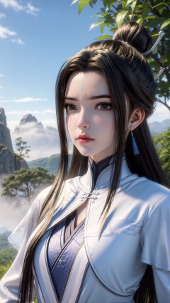 <lora:add_detail细节增加:0.7>,<lora:MHB:0.3>,1girl,solo,tassel,long sleeves,chinese clothes,outdoors,tree,long hair,black hair,sky,day,jewelry,earrings,hair ornament,blue sky,hair bun,half updo,cloud,mountain,cloudy sky,single hair bun,very long hair,forehead mark,facial mark,black eyes,hair stick,fog,sun,floating island,architecture,cliff,<lora:luxueqi:0.7>,long_legs,looking_at_viewer,weapon,sword,curvy,